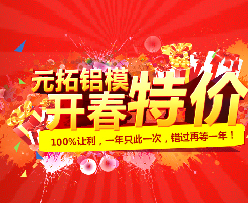 誰說鋁合金模板太貴?誰說沒有優(yōu)惠?羊年元拓鋁模最惠活動來襲,2015年3月2日-2015年3月31日期間元拓集團為回饋新老客戶特推出【鋁模?大酬賓活動】,鋁模產品百分百讓利,一年只此一次,錯過再等一年!