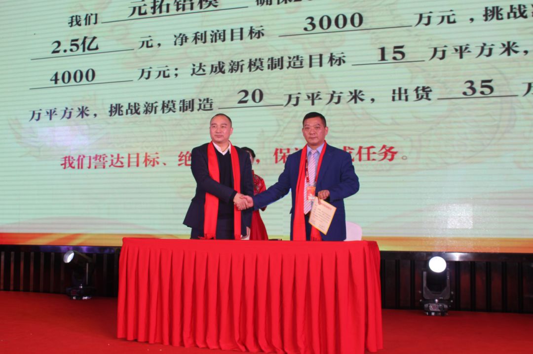 現(xiàn)場(chǎng),元拓建材集團(tuán)董事長(zhǎng)游炎明與三大業(yè)務(wù)板塊領(lǐng)頭人簽訂了2019年度經(jīng)營(yíng)目標(biāo)挑戰(zhàn)承諾書,三位領(lǐng)頭人再把任務(wù)進(jìn)行詳細(xì)分解并與下屬團(tuán)隊(duì)負(fù)責(zé)人簽署了目標(biāo)責(zé)任書。全體業(yè)務(wù)、生產(chǎn)骨干紛紛在臺(tái)上宣誓,2019年將全力以赴,堅(jiān)決完成挑戰(zhàn)目標(biāo)。